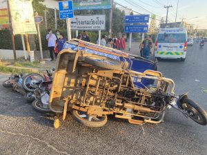620,6103,6115 ว.4 เหตุ ว.40 แยก รพ. มุกอินเตอร์ เป็นรถ 3 ล้อ ชนกับรถจักรยานยนต์ 2 คัน มีรถได้รับความเสียหาย 3 คัน มีผู้ได้รับบาดเจ็บ 3 ราย กู้ชีพนำส่ง รพ. รถกีดขวางการจราจร แจ้งร้อยเวร 40 ว.4 ที่เกิดเหตุเรียบร้อยครับ