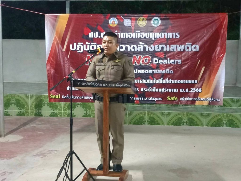 พ.ต.อ.ประยุทธ์ เรือนทองคำ. ผกก.สภ.เมืองมุกดาหาร ร่วมขับเคลื่อนนโยบายการป้องกันและปราบปรามยาเสพติดในพื้นที่อำเภอเมืองมุกดาหาร No D rugs No Dealers ณ ศาลาการเปรียญวัดอัมพวัน บ้านคำเขือง ม.3 ต.คำอาฮวน และตรวจเยี่ยมจุดสกัดบ้านพานอ้น. ต.คำอาฮวน. โดยมี นายชายสิทธิ์ สุวรรณโชติ นายอำเภอเมืองมุกดาหาร เป็นประธาน