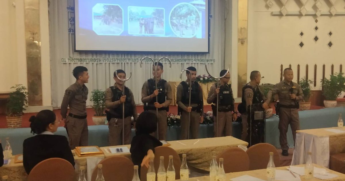 พ.ต.ท.ภาคภูมิ หมื่นราชา สวป(ชมส.).สภ.เมืองมุกดาหาร ,ร.ต.อ.จิรวุฒิ เทพบำรุง ร้อยเวร20พร้อมกำลัง สายตรวจชุดที่4 ได้บรรยาย,สาธิต การใช้ไม้ง่ามต่อบุคคลคุ้มคลั่ง ที่ โรงเเรมพลอยพาเลท
