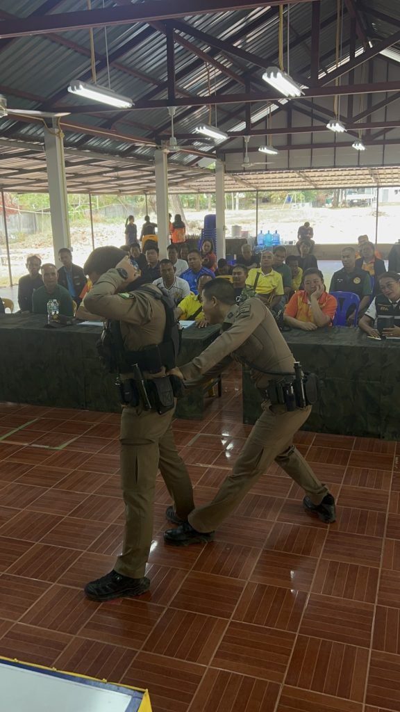 วันที่ ๑๒ ธ.ค. ๒๕๖๗ เวลาประมาณ ๑๓.๐๐ น. พ.ต.ท.คมกริช วงษ์ชารี รอง ผกก.ป.สภ.เมืองมุกดาหาร พ.ต.ท.อำพร สพานหล้า สวป.สภ.เมืองมุกดาหาร พร้อม ร.ต.อ.อนิรุทธ์ ไชยรัตน์ รอง สวป.สภ.เมืองมุกดาหาร ปฏิบัติหน้าที่ ร้อยเวร ๒๐ สายตรวจชุดที่ ๓ บรรยายและสาธิตยุทธวิธีการเข้าตรวจค้นบุคคลในโครงการเสริมสร้างความมั่นคงจังหวัดแบบบูรณาการ กิจกรรมฝึกอบรมภาคประชาชนเพื่อมีส่วนร่วมในการรักษาความมั่นคง รุ่นที่ ๑-๓ ประจำปีงบประมาณ ๒๕๖๗ ณ หอประชุมกองร้อยอาสารักษาดินแดนจังหวัดมุกดาหาร ที่ ๑